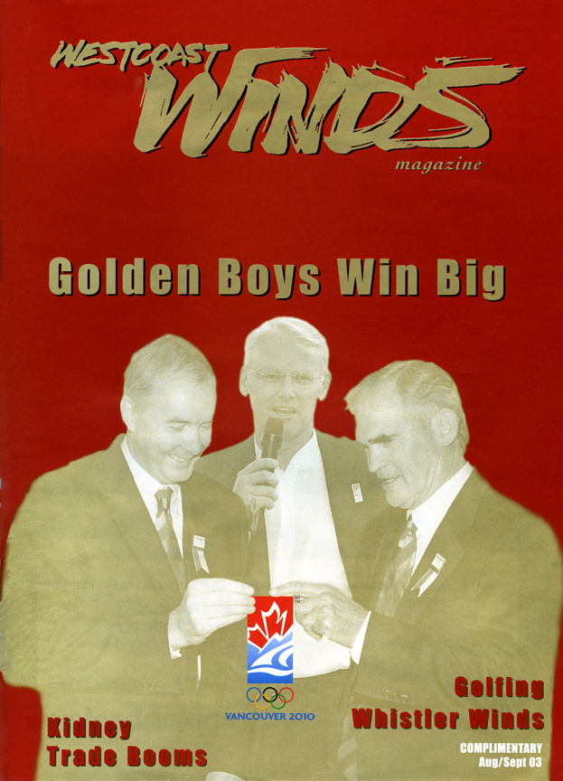 When Vancouver was awarded the right to host the 2010 Olympic Winter Gamesit was a victory for all of us.  Three of the main architects of the winning bid were John Furlong, Gordon Campbell and Jack Poole.  This cover ismontage of two separate shots.  The first one is of John and Jack looking ata Lucky Loonie coin before entering the main assembly hall to present Vancouver’s bid to the IOC.  The second shot is of Gordon Campbelladdressing a group from the Vancouver Delegation at a reception in Prague. The Photo Editors form West Coast Winds magazine combined them into an interesting collage.